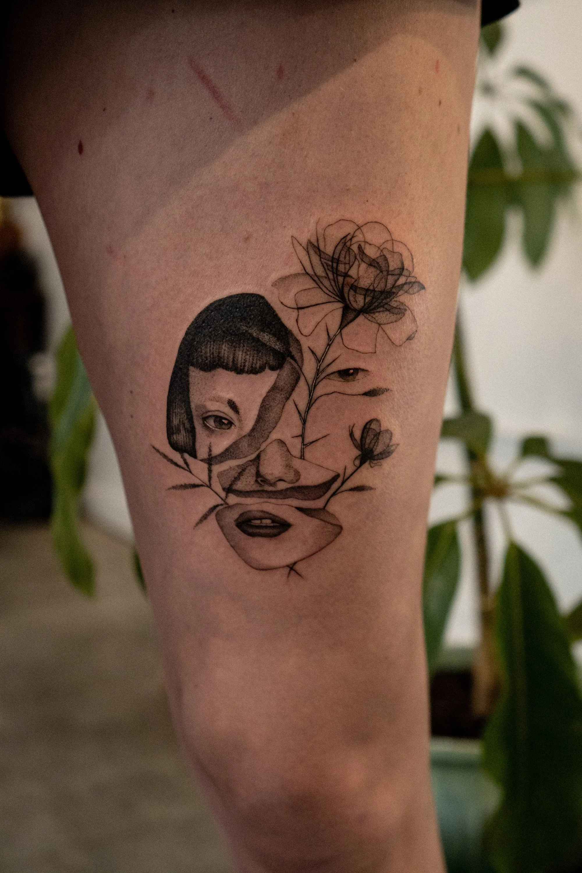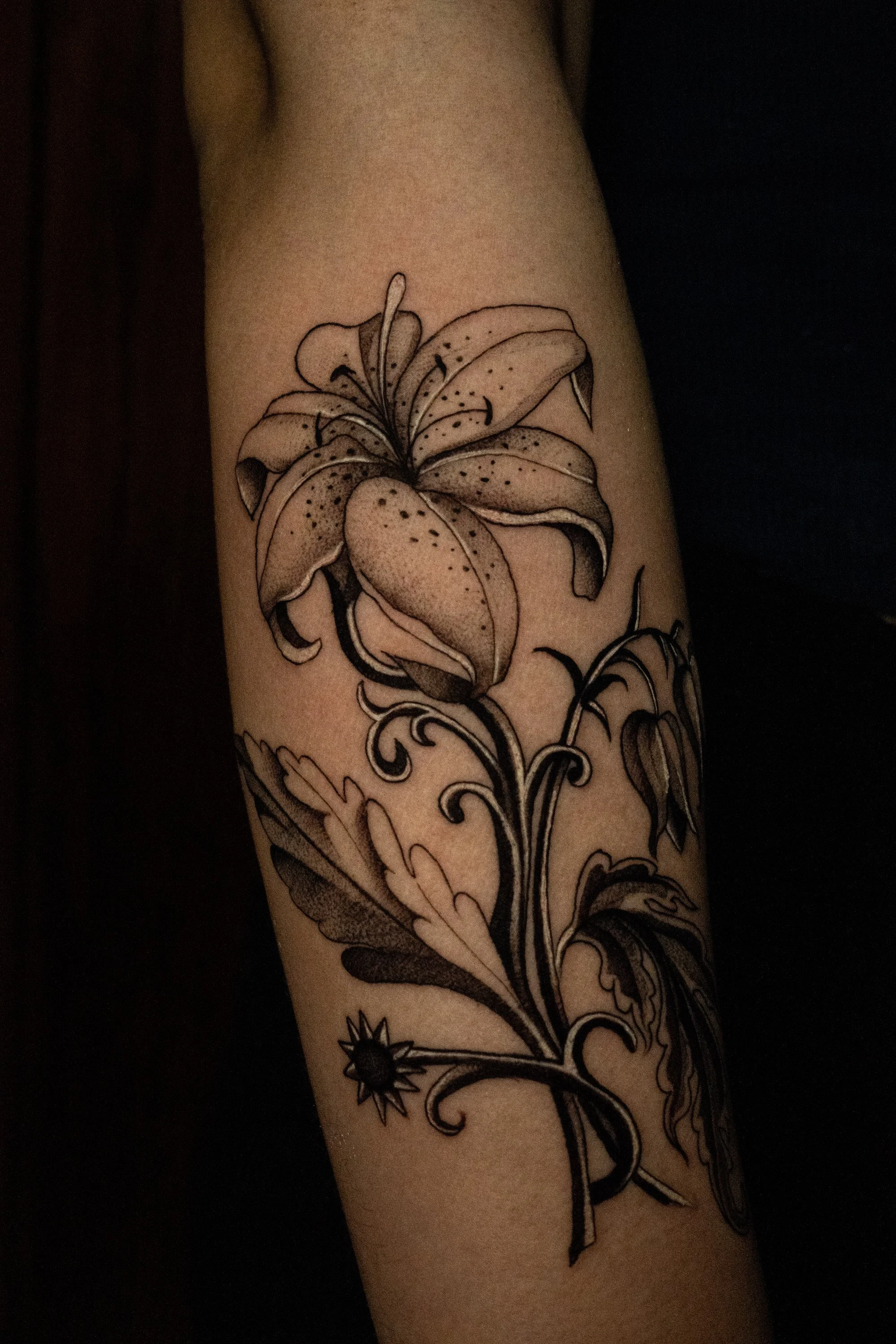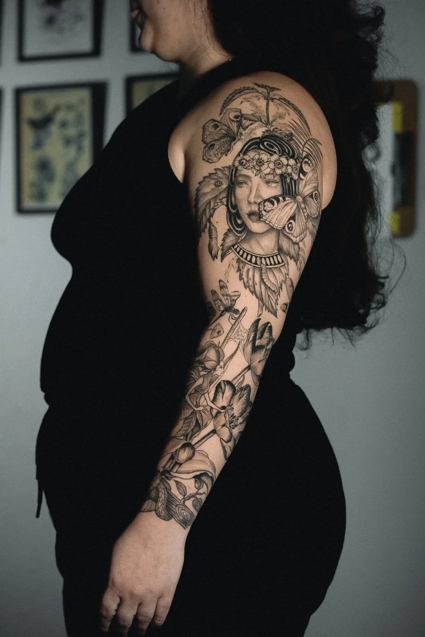 Bluebird is our freehand specialist, and utilizes this method to create pieces that compliment the shape of the client’s body. Her main focus is black and grey, fine line, and dot work tattoos, and she uses her illustrative skills to create unique designs that evoke a surrealistic feel. Bluebird also loves tattooing botanicals and nature, anime, gothic and victorian styles, spooky themes, and ornamental.